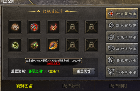 每类配饰凑齐后会给你一条随机特效属性,也是前期差异最大的地方。刷新特效也仅需要分解配饰而来的邪恶之泪+金条,