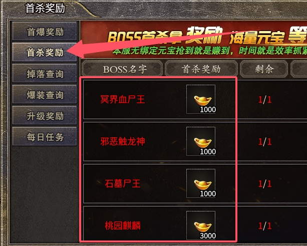 1.首杀首爆以及新区活动获取得元宝均不绑定