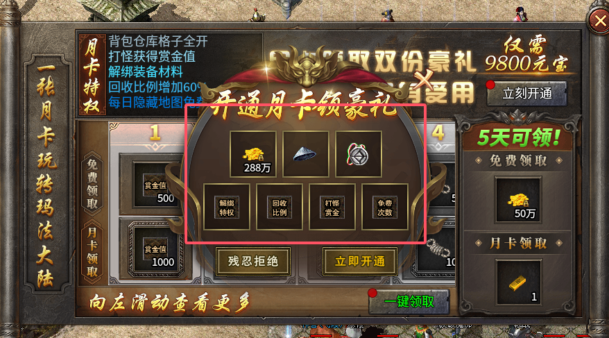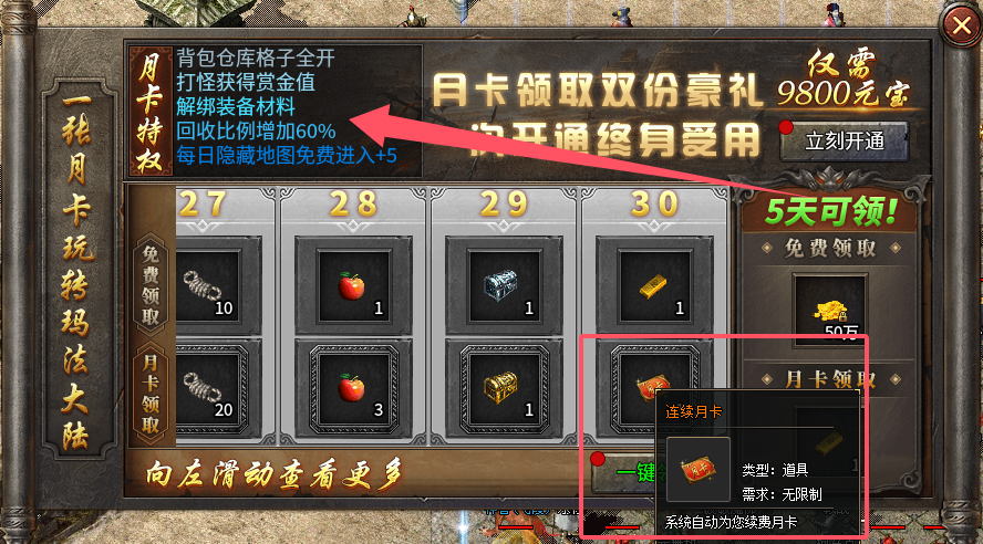 2、唯一月卡!开通月卡每天获得相对天数的材料金币以及属性!月卡消耗9800元宝解锁,也能白嫖获取,最后面会详细说。