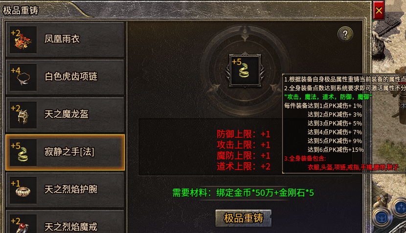 本服所有装备掉落都有高概率附加随机的小极品属性,最高+6点(+6并不算太难出,概率肉眼可见);允许极品重铸(数量不变,重新随机词条)且成本也并不高