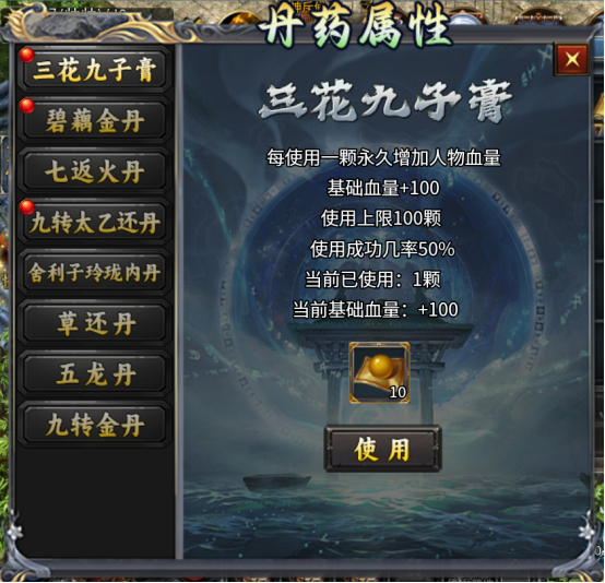 太乙还丹 使用后增加人物打怪伤害,全名:九转太乙还丹