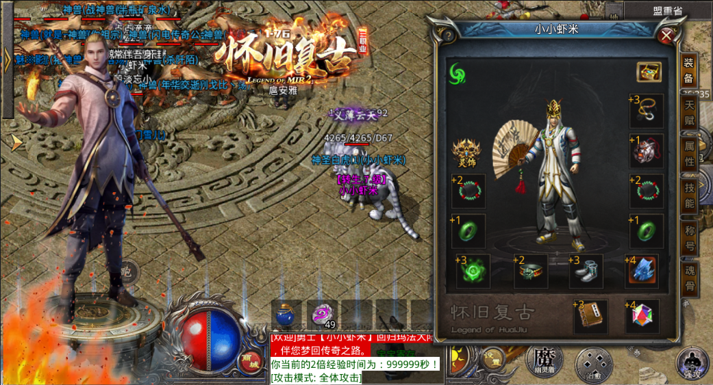2、60级召唤白虎,65级召唤神圣白虎,还可以通过技能铭文获得更高级的宝宝,让你打BOSS会更轻松