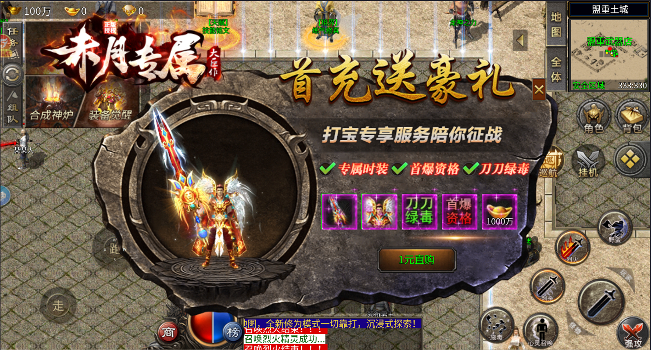 2、一元首充送豪礼 送专属时装 送首爆资格 送刀刀绿毒。进游充值一个1元首冲即可玩转全服