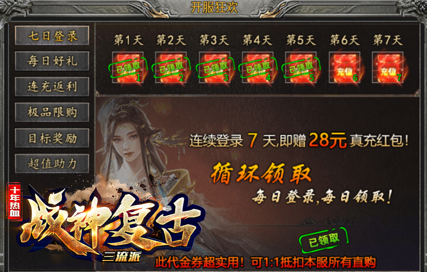 开服狂欢内,登录即可领取代金券,1:1抵扣本服所有直购礼包